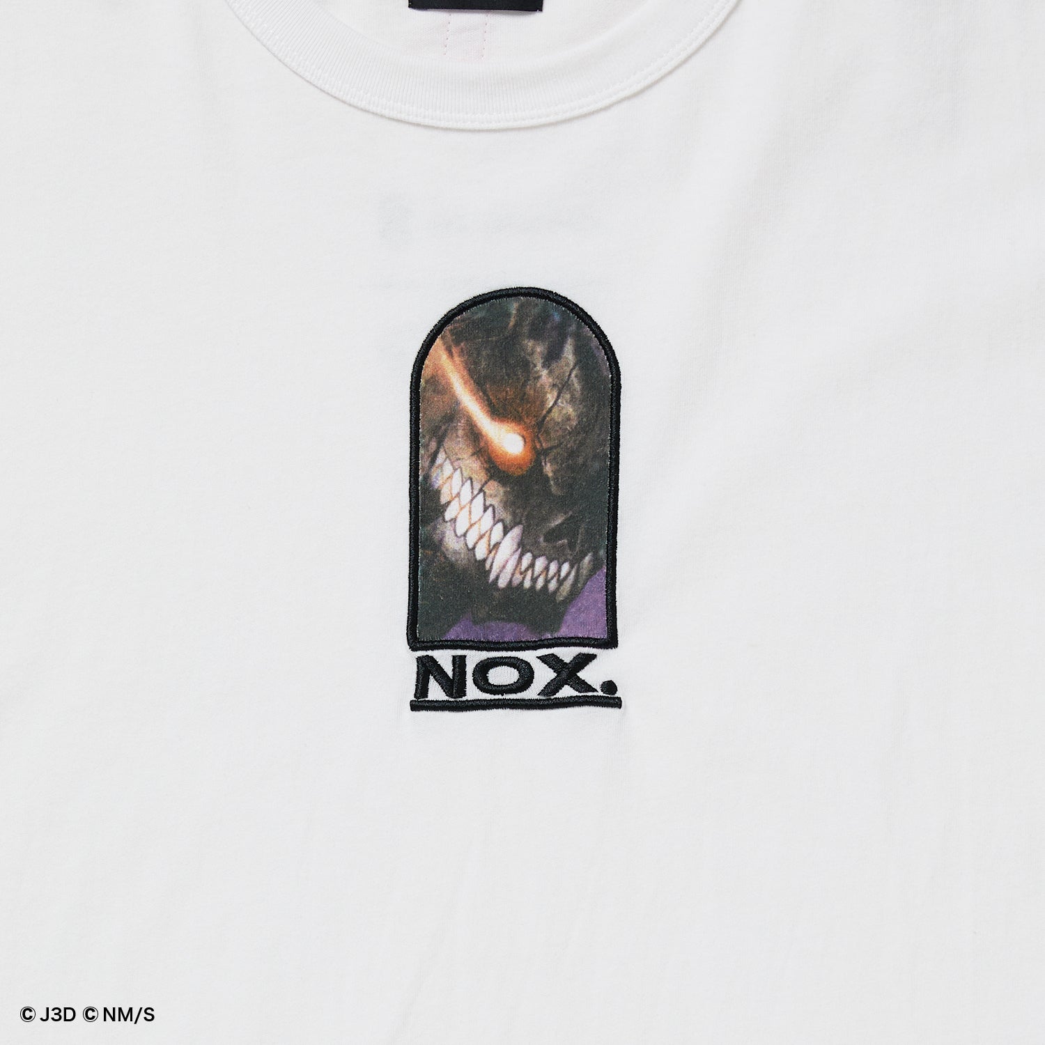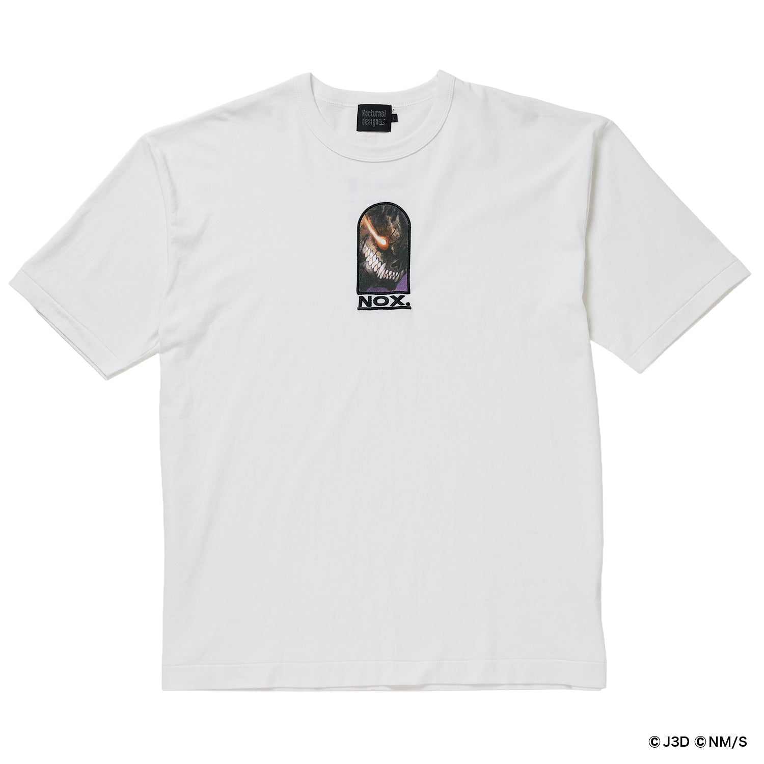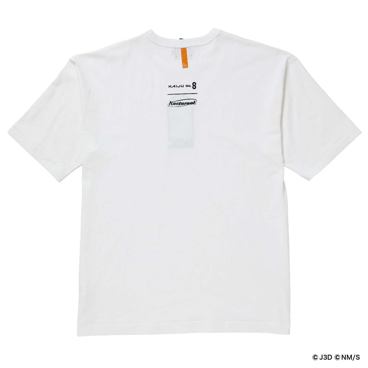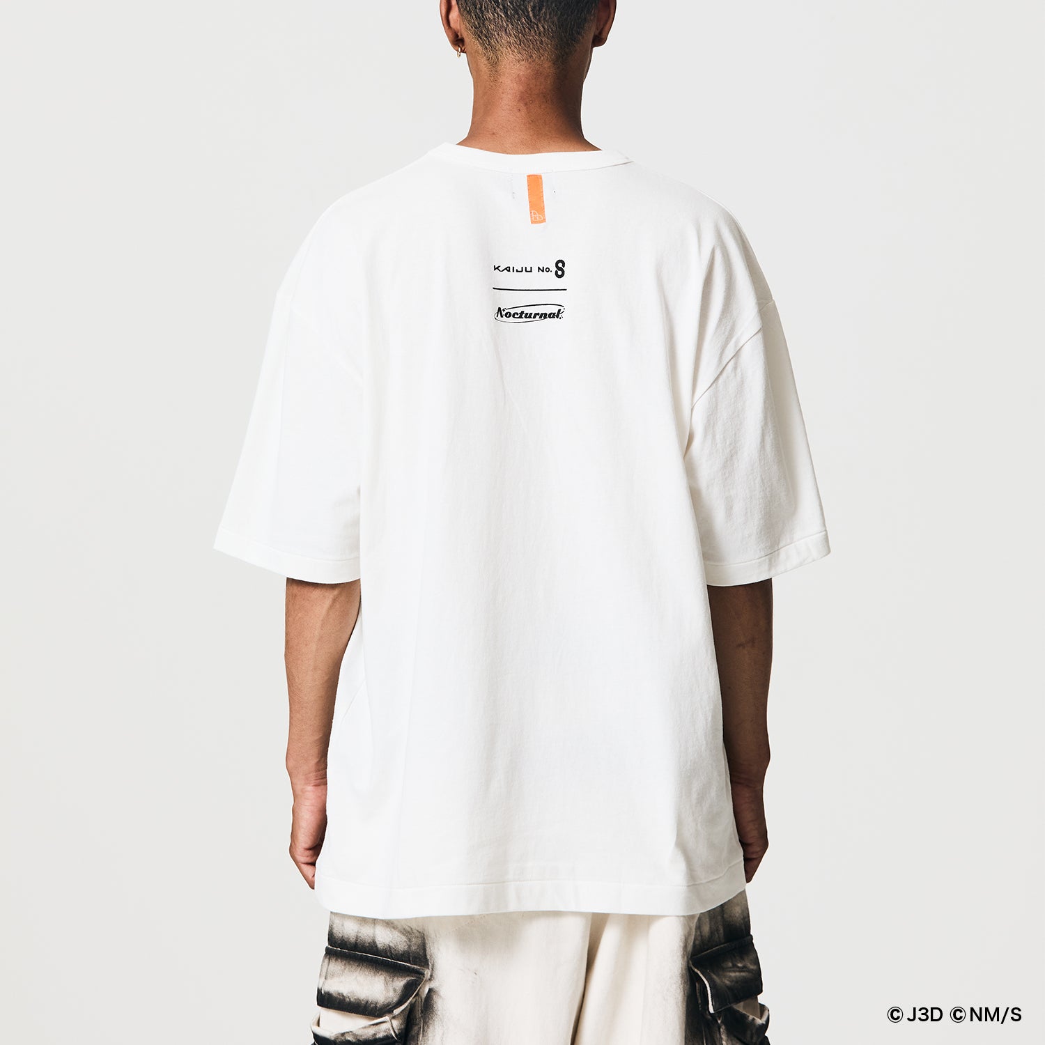 「怪獣8号」の迫力と哀愁感あるグラフィックが、窓枠の向こうに広がります。グラフィック部分はインクジェットプリントで、ロゴとフレーム部分を刺繍で仕上げています。背面には『怪獣8号』と“Nocturnal design”のロゴが並びます。